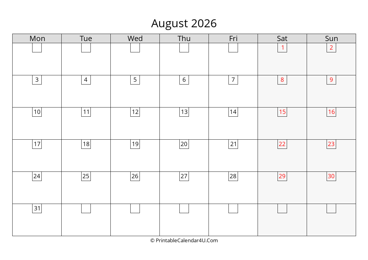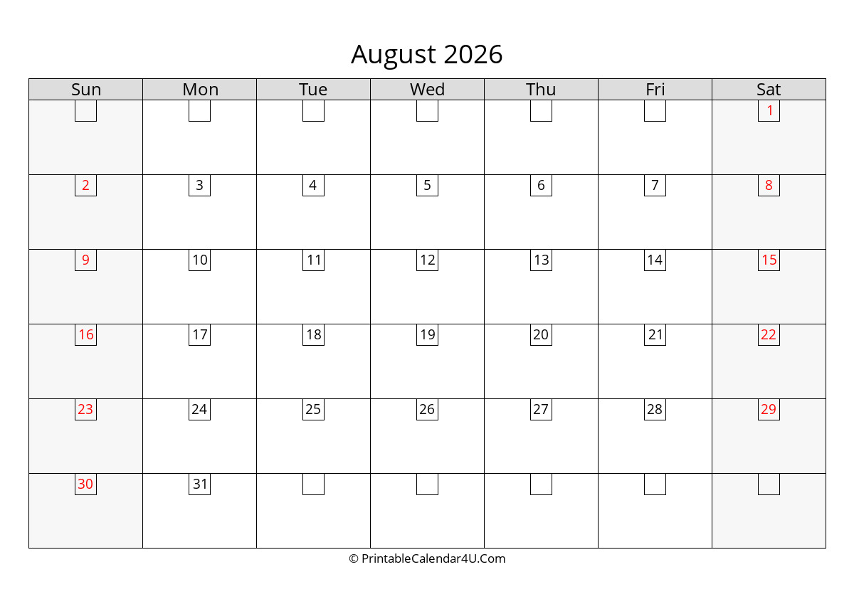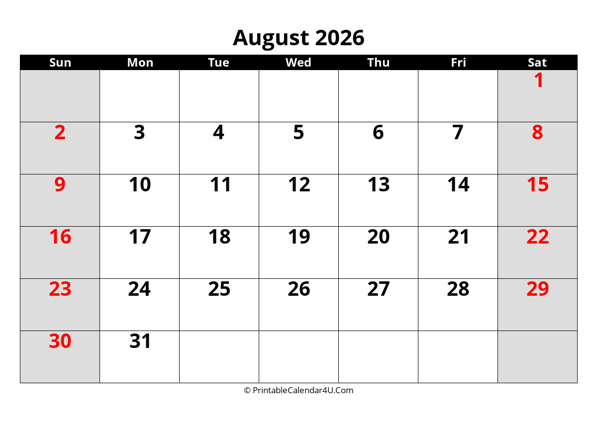 This August 2026 Calendar has a grey and black design with large font size. The weekends are highlighted in color to make them stand out more. The calendar has plenty of space to help you plan out your month and it’s easy enough to glance at when you’re on the go.