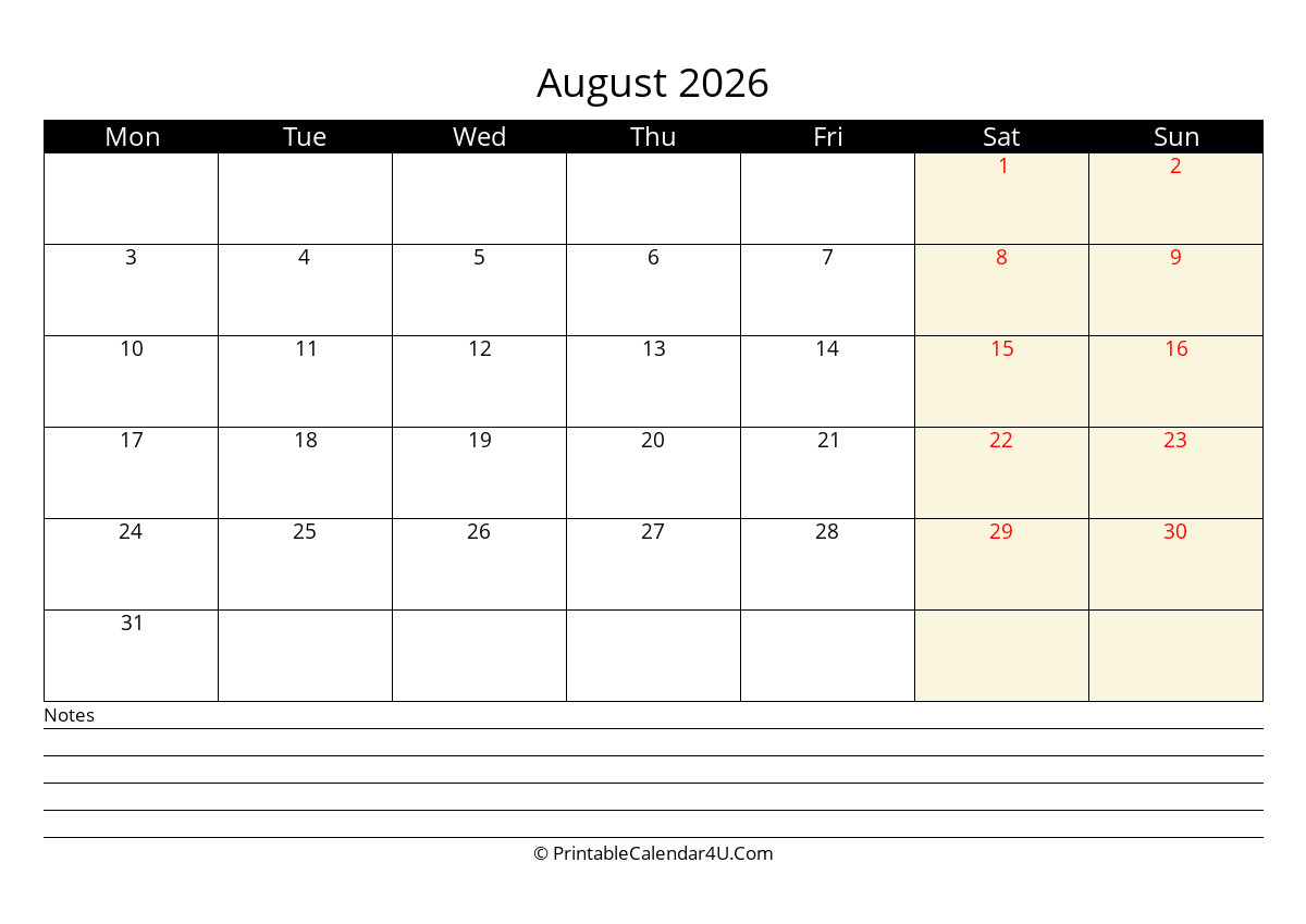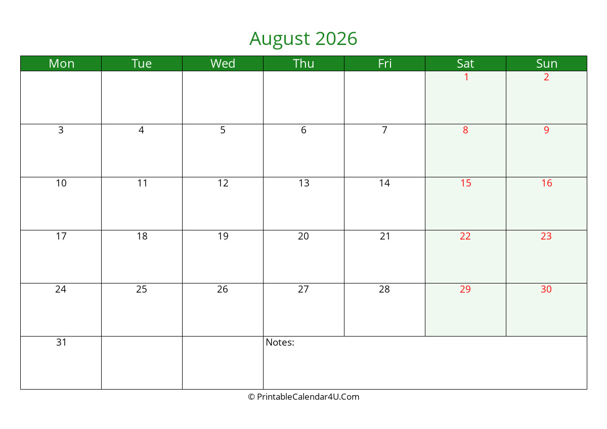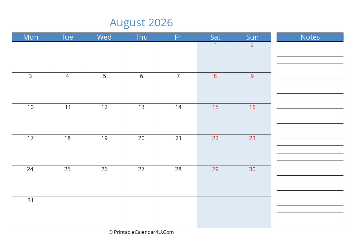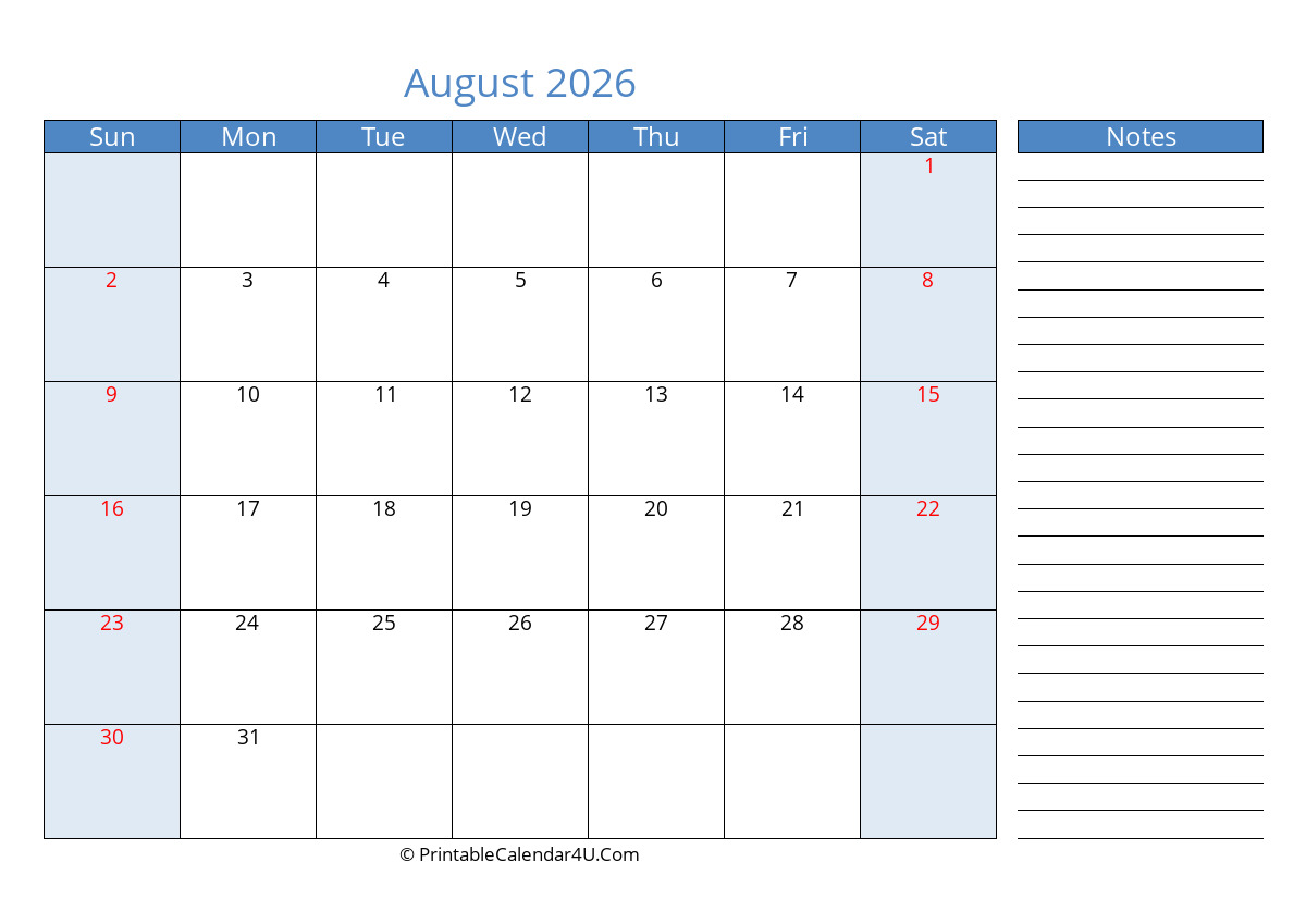 August 2026 Monthly Calendar with Notes
