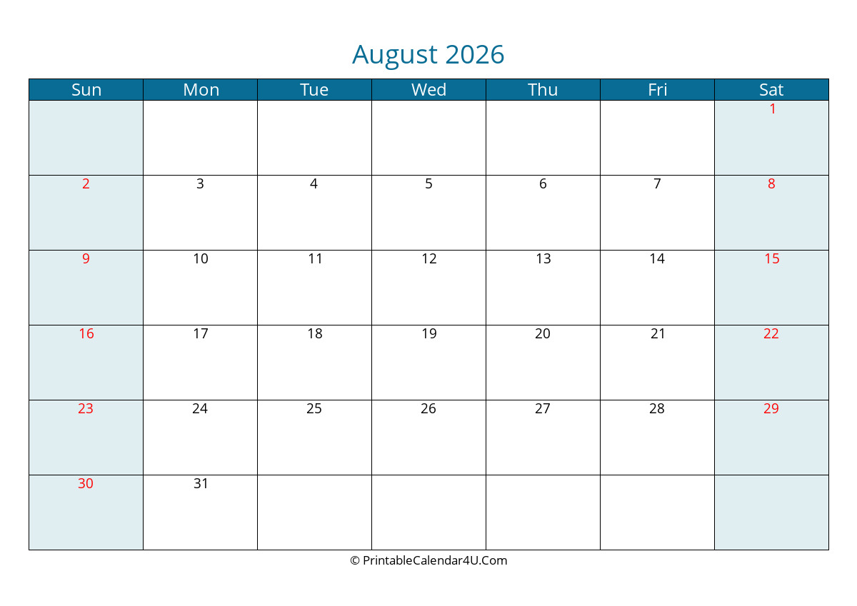 august 2026 calendar, highlighted weekend, week starts on sunday
