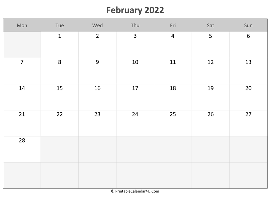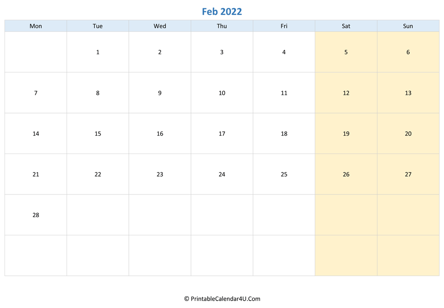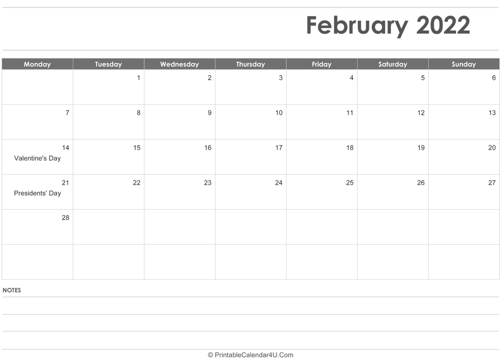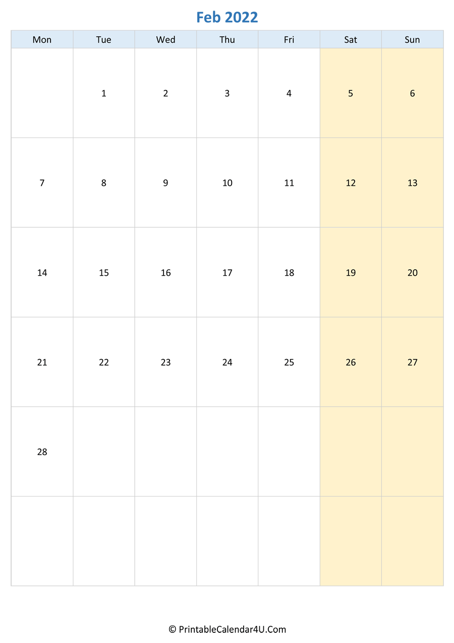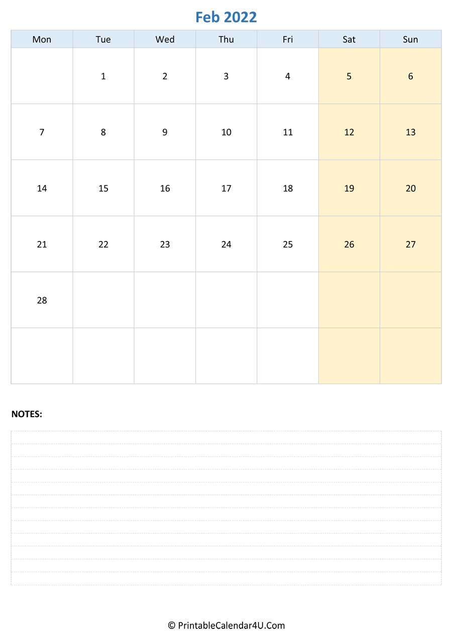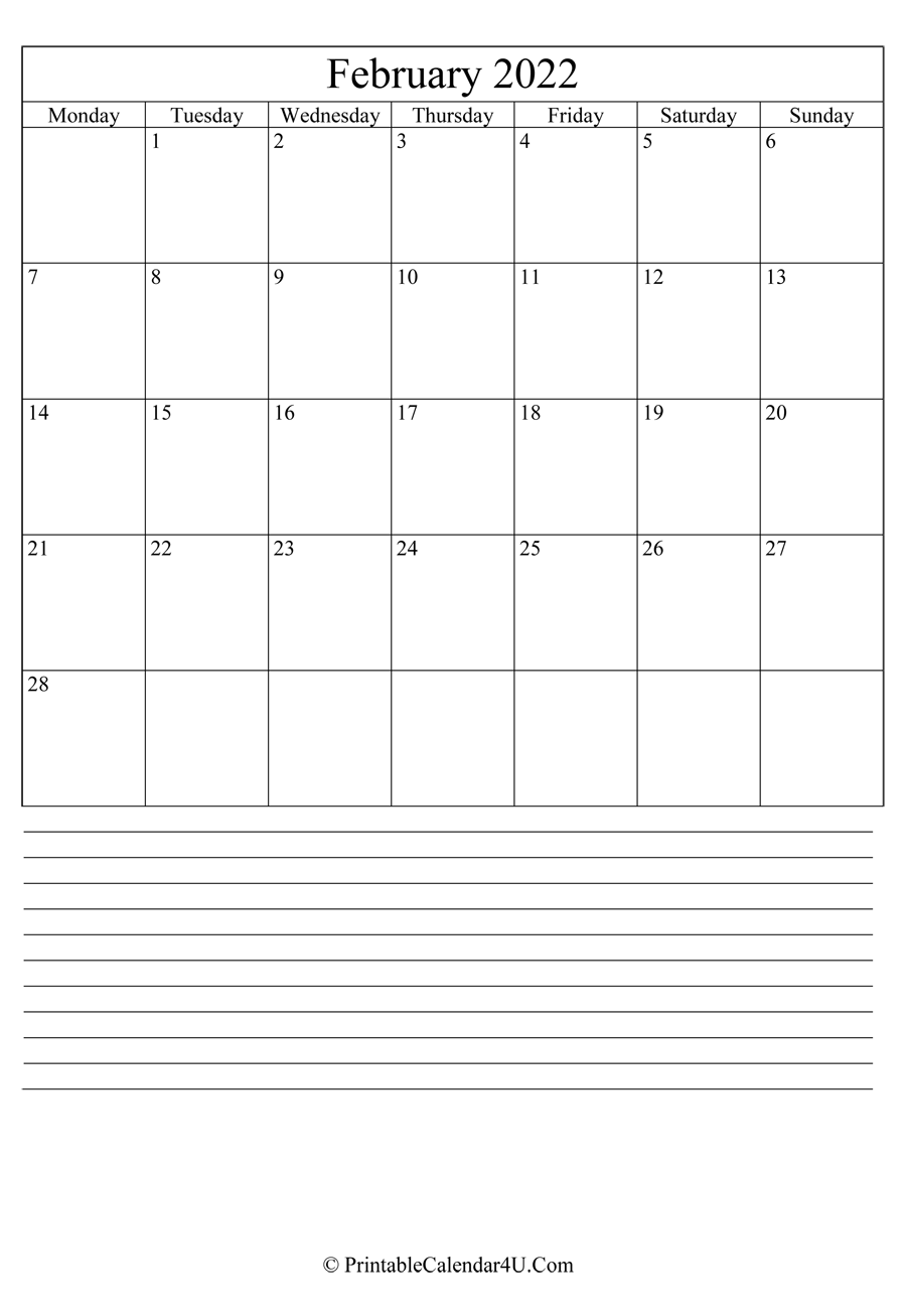 Here are all our free February 2022 Calendar Templates for you. Print your 2022 February calendar printable to stay organized. This free Printable 2022 Monthly Calendar is available in Monday and Sunday starts.