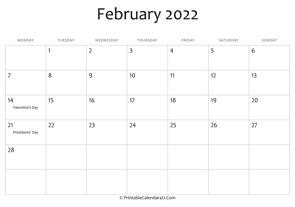 Free February 2022 Editable Calendar with Holidays. The calendar can be download as Word(.docx) or PDF format. You can also edit and add your important notes before print with word version. Recommend to print with landscape layout.