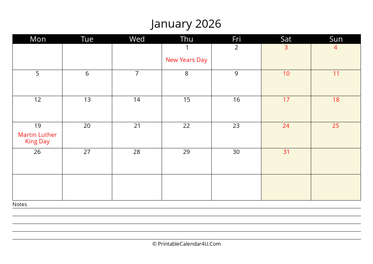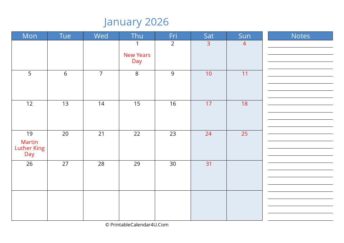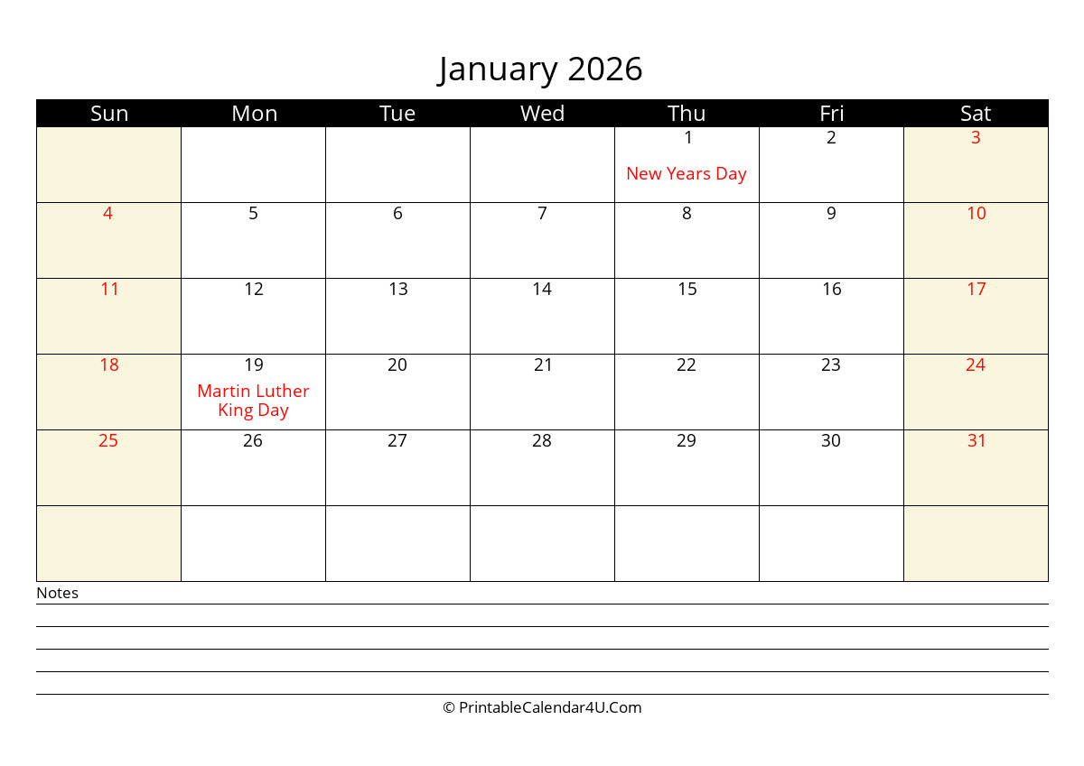 The Compact January Calendar 2026 is a monthly planner with a section for notes. It has an ample amount of space to write and plan out each day or to simply write down notes you may need to remember in your everyday life.