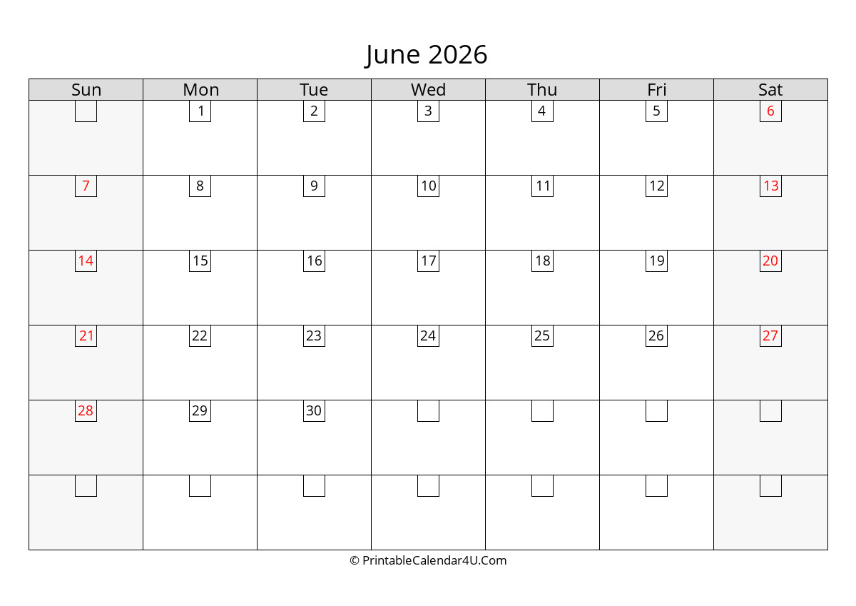 2026 june calendar with days in boxes, week starts on sunday