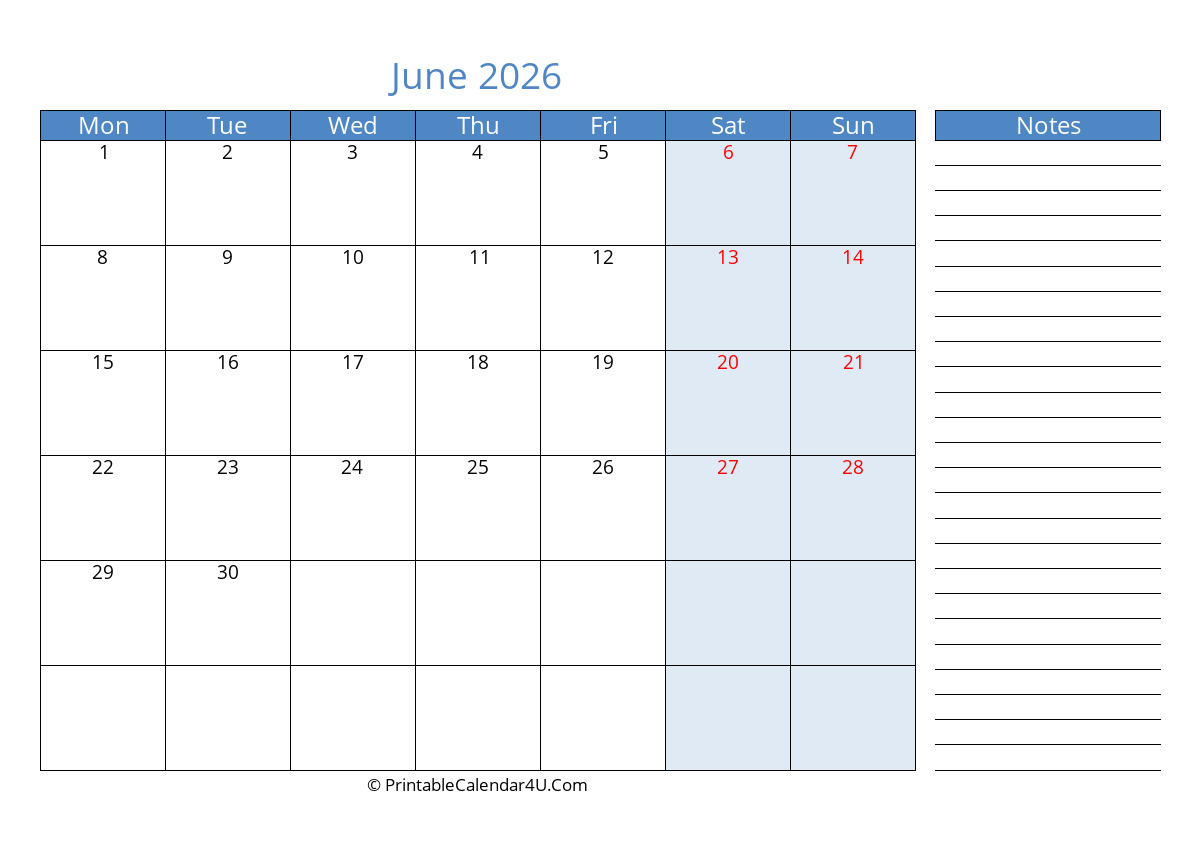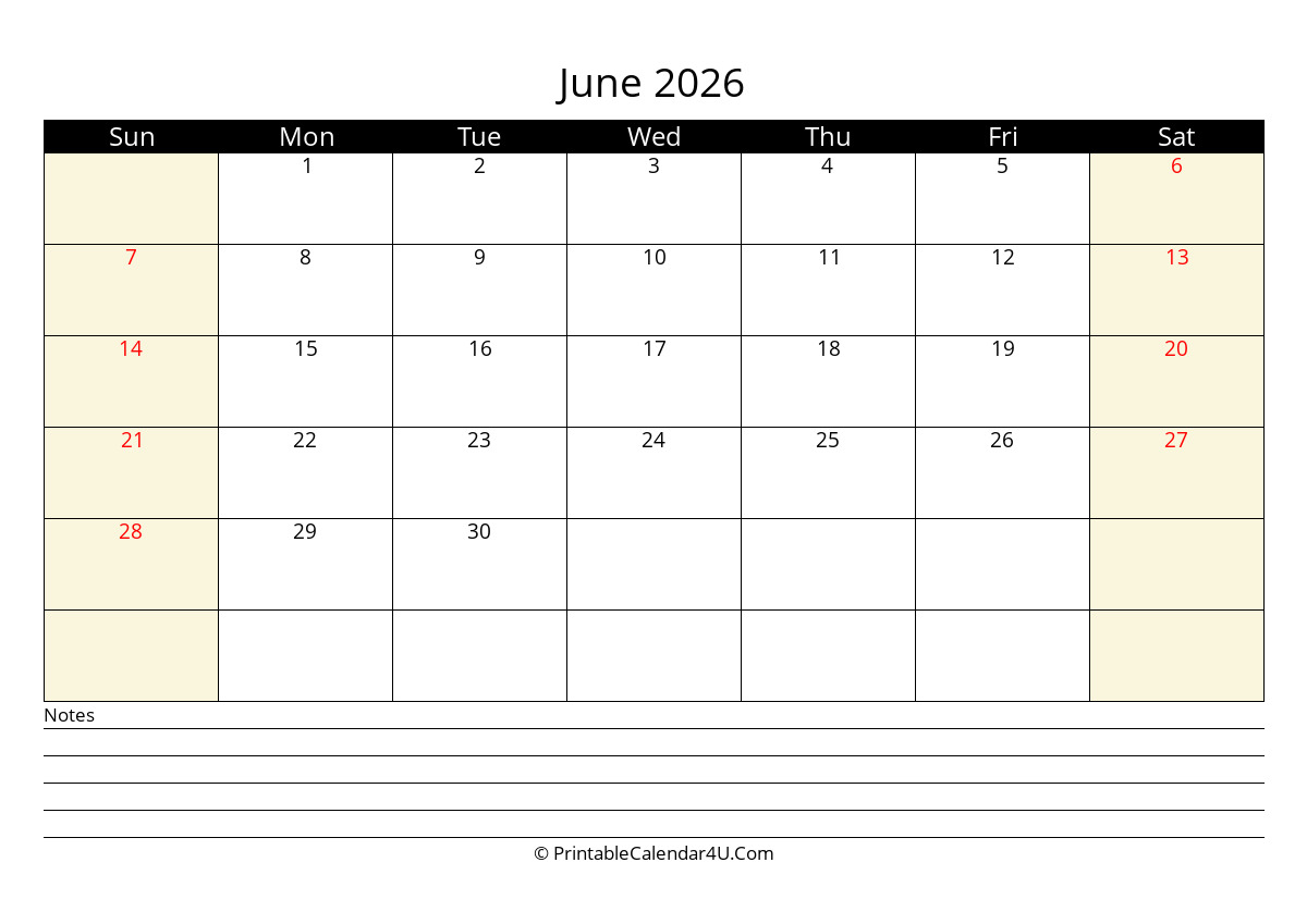 June 2026 Monthly Calendar with Notes