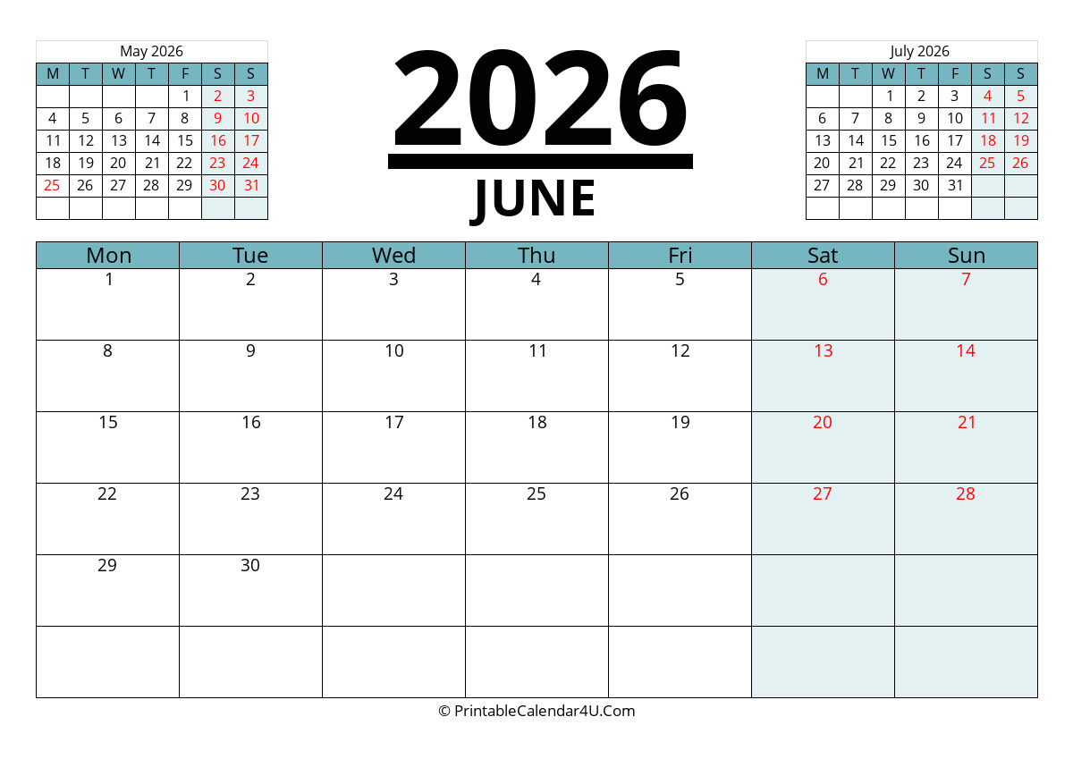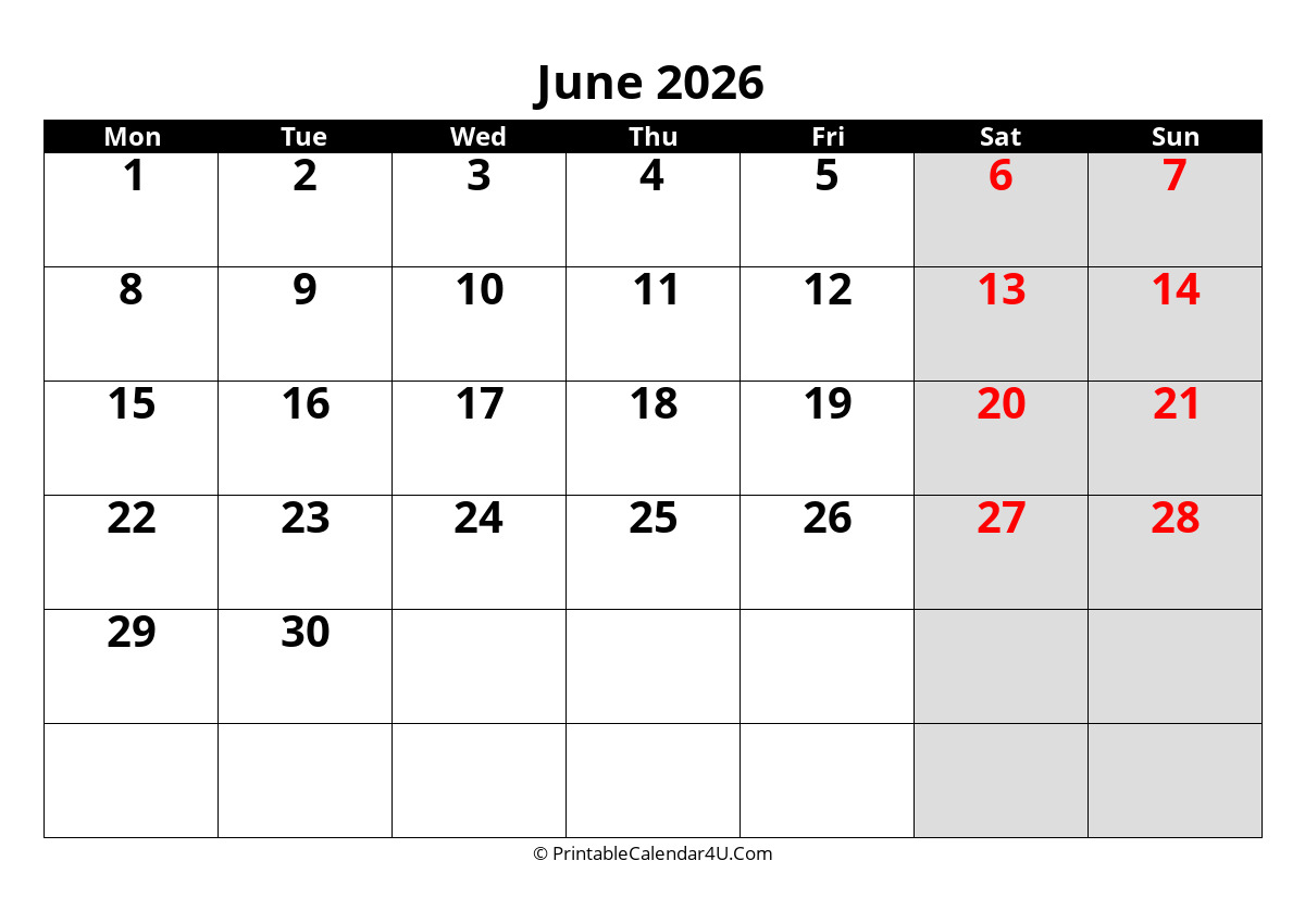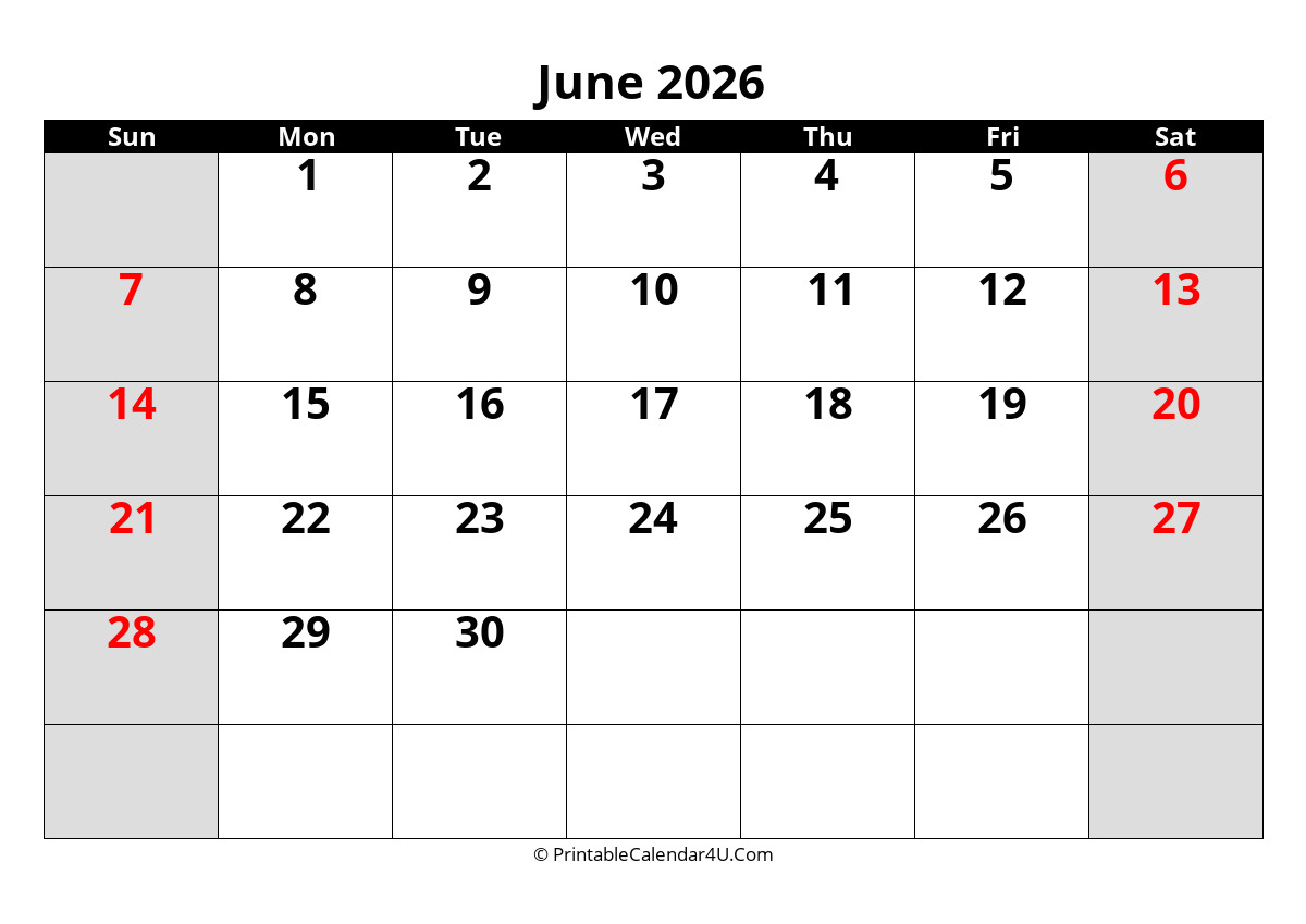 This June 2026 Calendar has a grey and black design with large font size. The weekends are highlighted in color to make them stand out more. The calendar has plenty of space to help you plan out your month and it’s easy enough to glance at when you’re on the go.