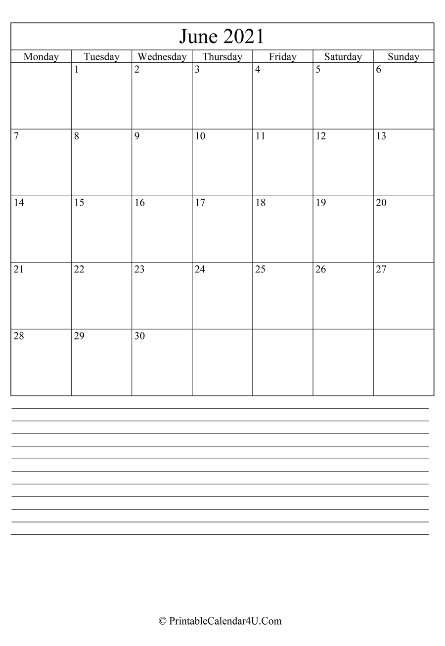 Printable June Calendar 2021 is an other editable calendar with portrait layout. Its also have a space at the bottom to write important notes.